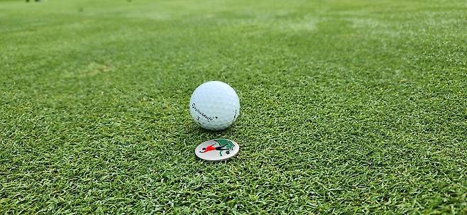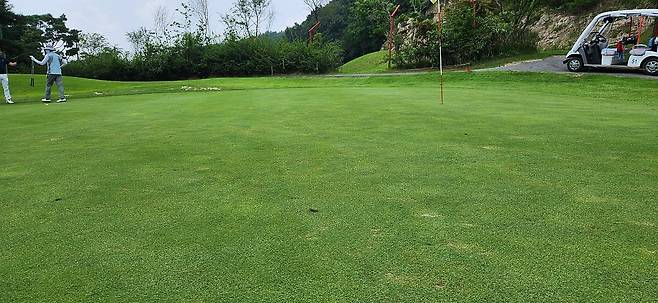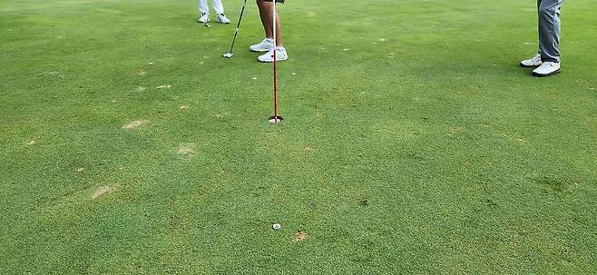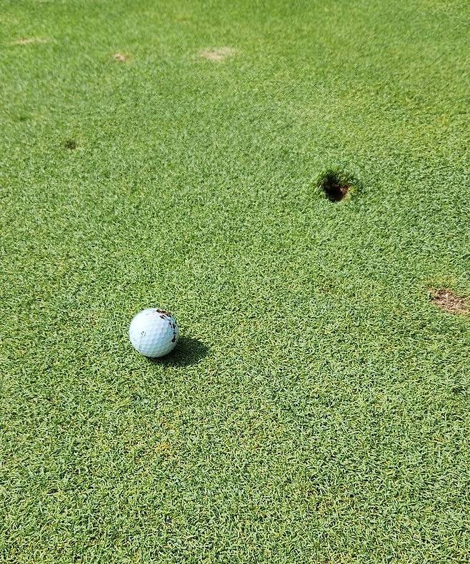 최근 비가 많아서인지 그린 잔디를 자주 깎지 못했나 봅니다. 표면 또한 공에 찍힌 피치 마크가 수두룩해서 공이 튀지 않고 구를 수 있게 자주 수리해야 했습니다. 이전에 수리한 자국들도 제대로 보수하지 못했는지 누렇게 풀이 죽은 자국이 많아 안타까웠습니다.
