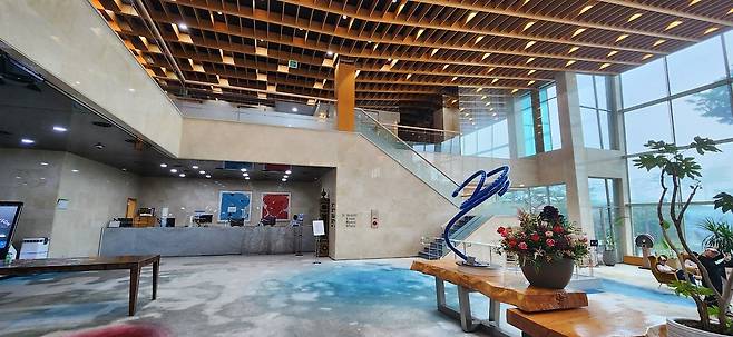 모던하고 깔끔해 보이는 클럽 하우스입니다. 바닥에 카펫이 깔려있는데 약간 바래 보이네요.