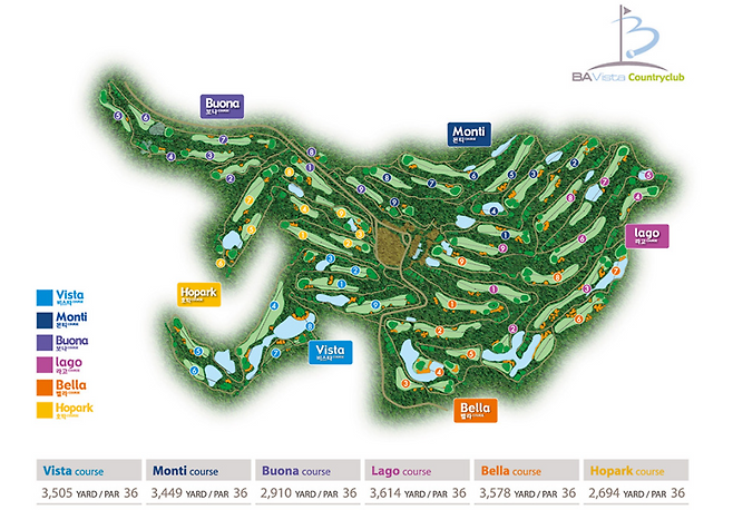 약 5년 전에 다녀온 걸로 기억하는데 실제로 골프장은 전혀 생각이 나지 않아서 새로운 마음으로 다녀온 비에이비스타 회원제 컨트리클럽입니다. 수원에서 이천까지 이동이 1시간 안으로 이동이 수월했고, 가보니 코스가 총 7개로 이뤄져 홀 개수가 무려 63개나 있다는 걸 처음 알았네요. 이날 플레이한 BA Vista의 벨라 코스와 몬티 코스 후기입니다.