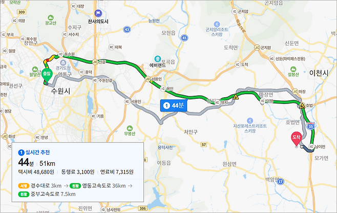 이동 거리 / 접근성: 8.5 점 (수원시청역 >> 비에이비스타 CC)