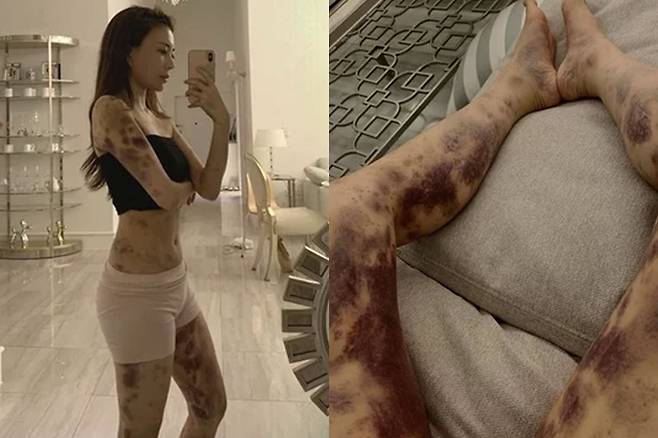 아옳이는 지난 2021년 "지난 일주일 너무 아프고 정말 교통사고 난 느낌"이라며 보기 힘들 정도로 온몸에 피멍이 든 사진을 공개해 충격을 안겼습니다.