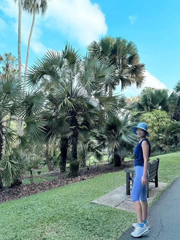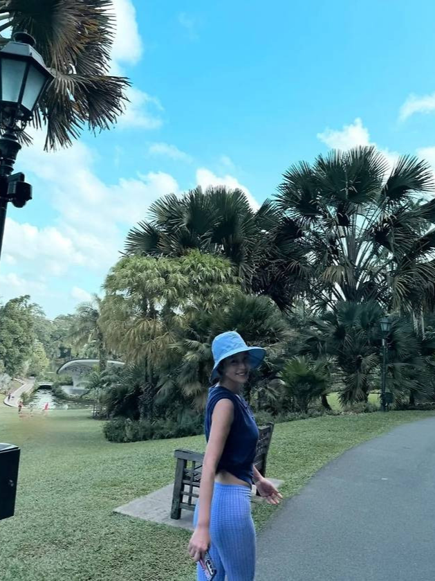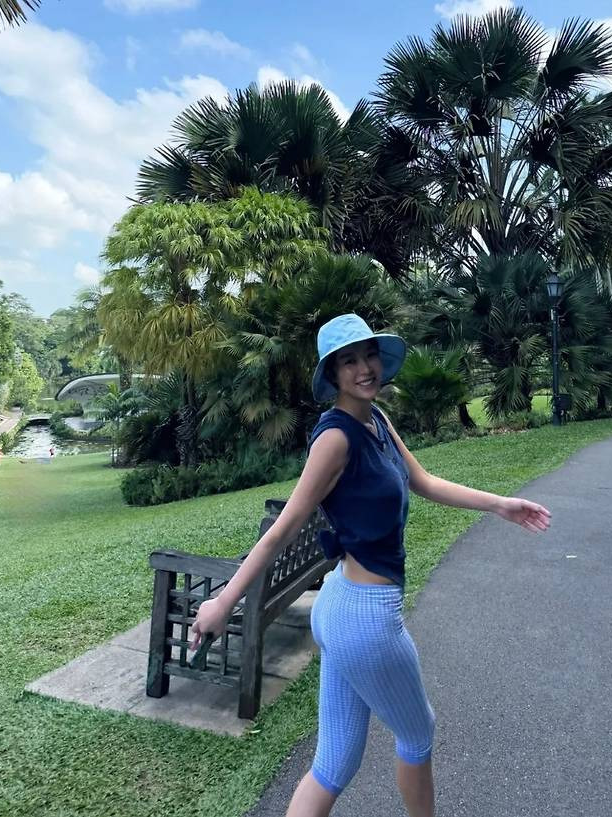 블루 컬러의 버킷햇과 네이비 슬리브리스 톱, 그리고 체크 패턴이 돋보이는 블루 레깅스로 트렌디한 애슬레저룩을 연출했습니다.