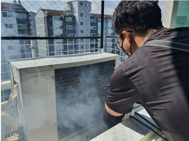 그다음 비둘기 배설물 제거 및 살균 작업이 필요한데요. 실외기를 부식시키는 비둘기 배설물을 완벽히 제거하기 위해 건식, 습식 청소를 진행하고, 연무 살균소독기를 여러 번 분사해 유해 성분을 완전히 제거해야 합니다.