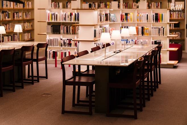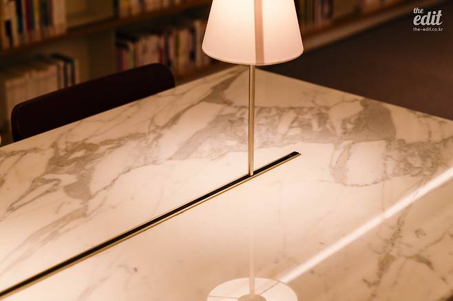 서가 한쪽에 크게 자리한 대리석은 이탈리아 까라라 지역에서 공수했다. 바다 건너 온 대리석이라니. 소전서림에서는 이 대리석에 추가 세공을 해서 스탠드를 설치했다. 많은 도서관을 다녀본 건 아니지만, 이 정도로 도서 환경에 공을 들이는 도서관은 처음이다.