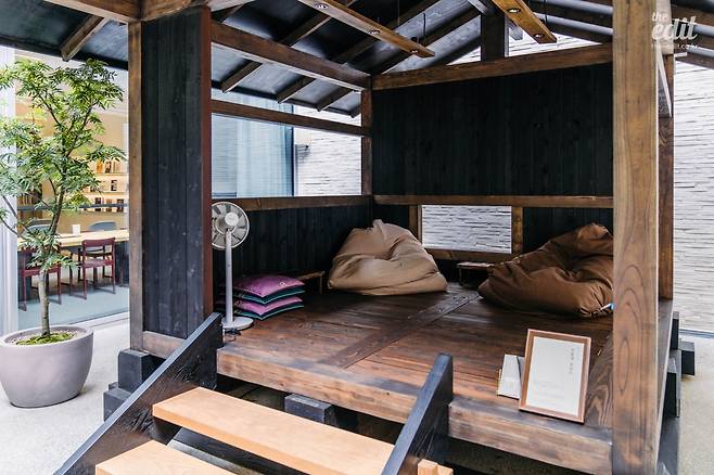 예담에서 바로 이어지는 문 밖으로 나가면 내촌목공소에서 만든 정자가 하나 놓여있다. 이름은 모동정. ‘동녘을 그리는 정자’라는 뜻이다. 위에서 살짝 언급한 인문학 레지던시 두내원이 만들어지고 있는 동쪽을 향하고 있다. 이날은 날씨가 더워서 밖에 앉아있긴 힘들었지만 조금만 선선해진다면 신선놀음하는 기분으로 빈백에 누워 계절을 만끽할 수 있을 것 같다.
