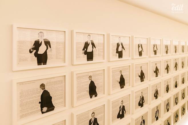 도서관 곳곳을 산책하듯 다니길 권한다. 책에서 발췌한 문장과 그림을 감상할 수 있기 때문이다. 2층으로 올라가는 계단에도, 책장에도, 심지어는 화장실로 들어가는 입구 옆에도 문장이 쓰여있다. 계단 옆 벽을 가득 채운 위 작품은 네마니아 니콜리치(Nemanja Nikolic)의 <Panic Book>(2013-2015)이다. 알프레드 히치콕의 <북북서로 진로를 돌려라>에서 주인공이 비행기에 쫓기는 장면을 재해석했다.