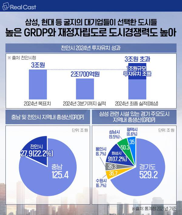 통계청에 따르면 충남의 2021년 기준 GRDP는 125.4조원이며 천안시는 27.9조 원으로 충남 GRDP의 22.2%를 차지하고 있습니다. 삼성관련 대규모 시설들이 공통적으로 자리잡고 있는 경기 수원(35.7조 원), 용인(35.3조 원), 화성(91조 원), 성남(50.3조 원), 평택(35조) 등 5개 도시의 GRDP 합은 경기도 GRDP(529.2조 원)의 46.1%를 차지하고 있습니다.