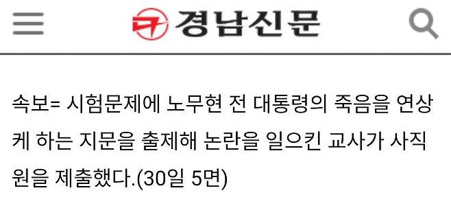 속보= 시험문제에 노무현 전 대통령의 죽음을 연상케 하는 지문을 출제해 논란을 일으킨 교사가 사직원을 제출했다.(30일 5면)경남교육청은 30일 해당학교를 방문해 학교 관리자와 해당 교사 등을 만나 조사를 ...