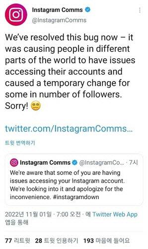 인스타그램 측은 이날 공식 트위터 계정을 통해 “이번 버그를 해결했다. 세계 여러 지역의 사람들이 계정에 접속하는 데 문제가 있었고 일부 팔로워 수가 일시적으로 변경되도록 했다. 미안하다!”라며 장애 복구를 선언했다.