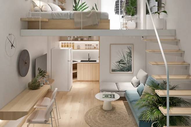 복층 설계를 통해 천장이 높아져, 일반 원룸에서는 느끼기 힘든 수직적 공간감을 제공한다. 또한, 바닥에 숨겨진 수납 공간은 좁은 곳에서도 효율적인 정리를 가능하게 한다.