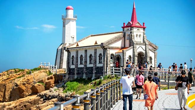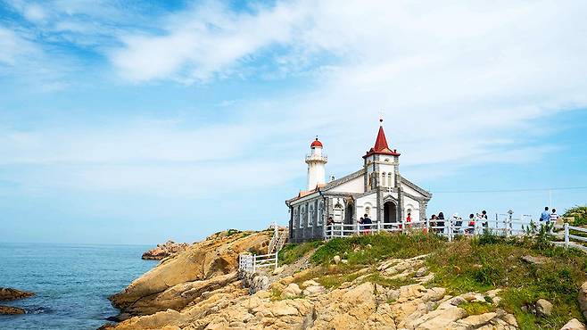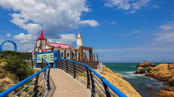 바다와 맞닿은 흰 벽, 붉은 지붕은 마치 유럽 해안 마을의 작은 성당을 떠올리게 하며, 파도와 어우러진 모습은 하나의 풍경화처럼 다가온다.
