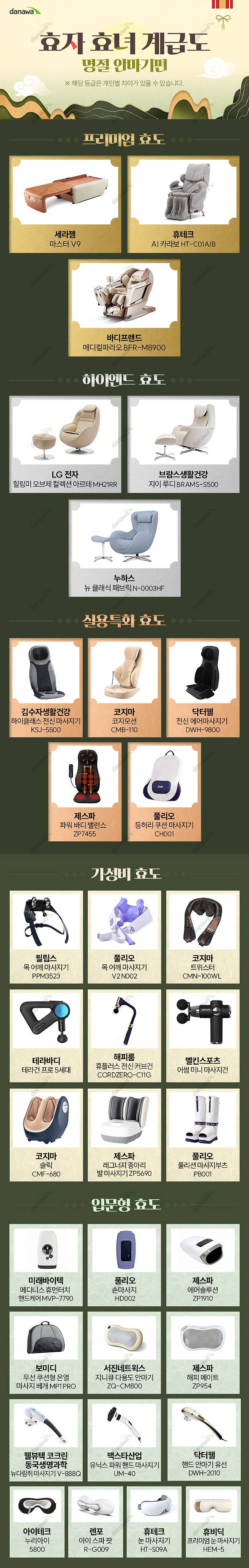 최장 10일에 달하는 황금 연휴! 고생하신 부모님을 생각하는 효자·효녀를 위해 600만 원대에 달하는 전신 안마의자부터 3만 원대 핸디형 안마기까지 안마기기 계급도를 살펴보았다. 중요한 건 무조건 값비싼 제품이 아니라, 사용자의 안마 부위나 사용 패턴을 고려해 딱 맞는 제품을 선택하는 것. 그리고 그보다 더 중요한 것은 바로 부모님을 위하는 마음이다. 선물도 좋지만, 이번 명절에는 잠깐이라도 부모님 어깨를 직접 주물러드려 보는 것은 어떨까?