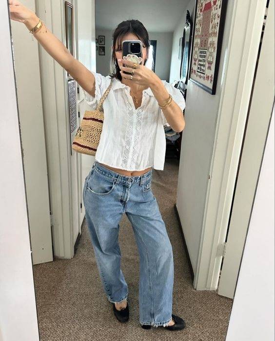 반팔 자켓과 블라우스에 데님 팬츠,