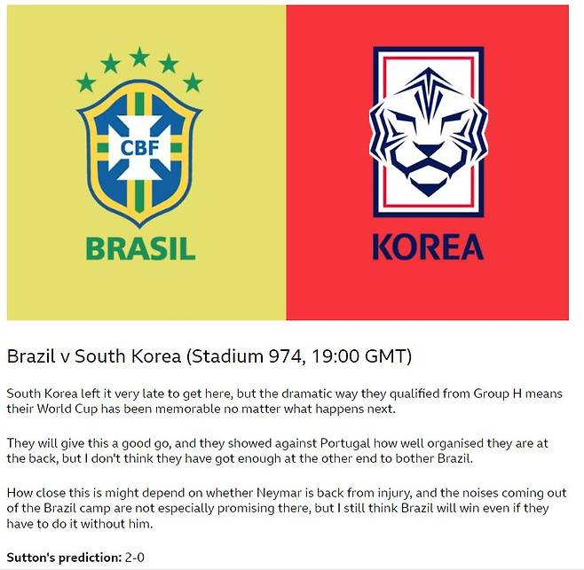 서튼은 “한국이 H조에서 극적으로 16강 자격을 얻었다. 다음에 무슨 일이 일어나든 그들의 이번 월드컵은 기억에 남을 것”이라면서도 “포르투갈을 상대로 그들이 얼마나 잘 조직돼 있는 팀인지 보여줬지만, 나는 그들이 브라질을 괴롭힐 만큼 충분하지는 않다고 본다”라고 이야기했다.