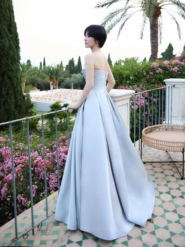 눈부신 하늘빛 드레스는 은은한 광택이 도는 실크 소재로 고운 피부 톤과 조화를 이루며 고급스러움을 배가시켰습니다.