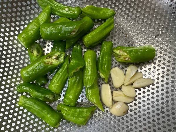 꽈리고추는 깨끗이 씻어 꼭지를 떼고, 포크로 구멍을 내거나 반으로 자릅니다.