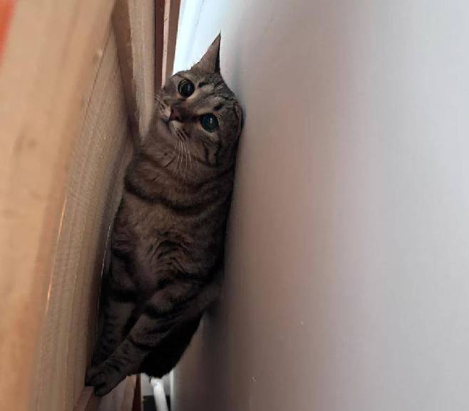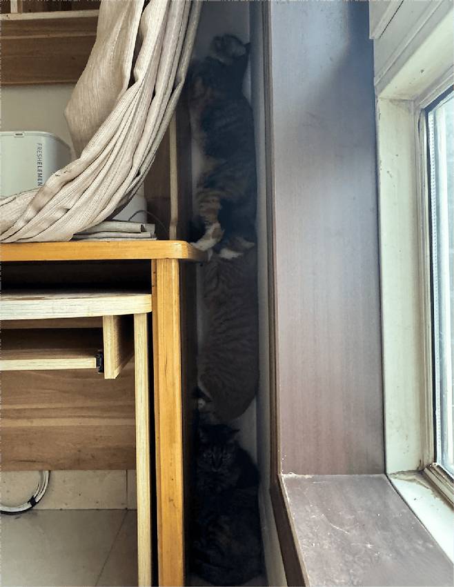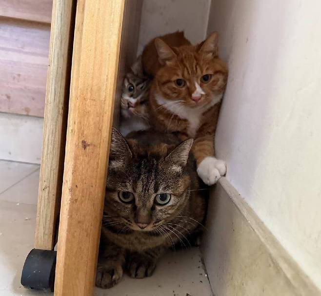 한 집사가 세 마리 고양이와 함께 이사한 첫날. 아직 이사 간 집이 익숙하지 않은 상황이었는데, 때마침 집사의 친구가 집에 방문했습니다. 한 번도 본 적 없는 낯선 사람이 들어서자 세 고양이는 재빨리 좁은 구석을 찾아 숨어버렸습니다. 그 모습은 마치 수직으로 쌓은 탑 같았는데, 서로 균형을 잡기 힘든 자리에서도 세 마리는 겹겹이 몸을 숨겼죠.
