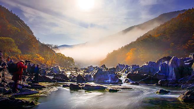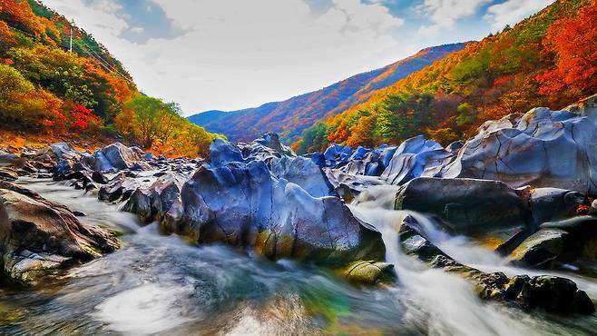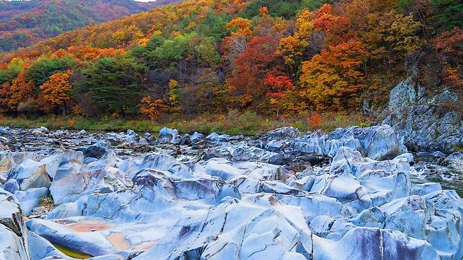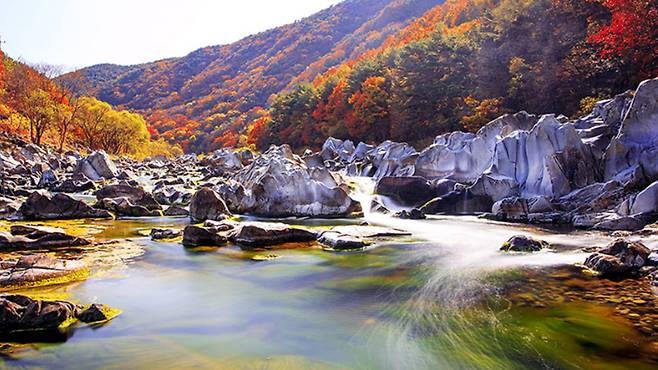10월 말, 나뭇잎이 붉고 노랗게 물드는 상강(霜降)의 계절. 경상북도 청송군 안덕면 고와리에는 가을의 끝자락을 온전히 느낄 수 있는 백석탄계곡(白石灘溪谷)이 자리합니다.