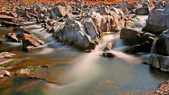 마치 누군가 조각해 놓은 듯 매끄럽고 은은한 윤곽의 바위 위로 단풍잎이 흩날리고, 햇살이 반사되어 눈부신 풍경을 만듭니다.