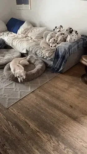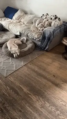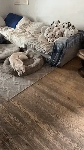 그런데 어찌 된 일인지, 점박이 무늬가 없는 강아지 한 마리는 소파 옆 강아지 침대에서 홀로 잠들어 있습니다.