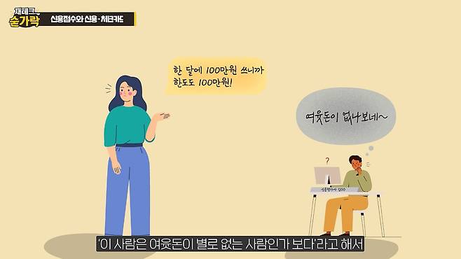 신용카드는 상품이나 서비스를 받고 일정 기간이 지나 값을 치르는 신용 거래 지불 수단이다. 이런 탓에 ‘빚’이 싫다며 신용카드를 쓰지 않는 사람도 있다. 김 교사는 “신용카드를 아예 쓰지 않는 것도 좋은 방법은 아니고, 적절하게 쓰는 것이 중요하다”고 했다. 이어 “신용카드 거래 없으면 금융이력이 부족해서 신용점수가 높아지기 어렵고, 추후 대출을 받을 때 불리하다”고 했다. 신용 점수는 단기간에 오르지 않기 때문에 미리 준비해야 한다.