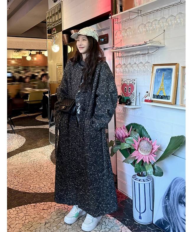 두툼한 질감의 롱코트가 주는 묵직함을 가벼운 레깅스와 스니커즈로 중화시켜, 세련된 감각을 놓치지 않는 '꾸안꾸' 패션의 정석을 보여주고 있어요.