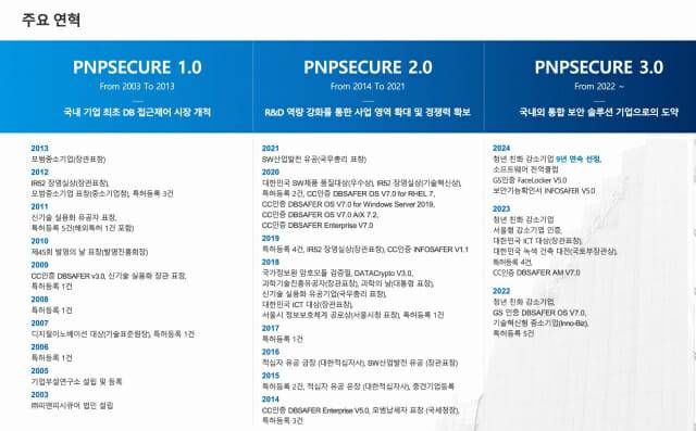 기술력 상징인 특허는 39건을 보유하고 있다. 인증은 CC인증 7건, GS인증 11건 등 총 42종을 갖고 있다. 여러 상을 받았다. 대한민국 ICT 대상 장관 표창(2023년)과 과학의 날 대통령 표창(2018년) 등 24차례 받았다. 직원 복지도 '시선'이 간다. 하루 7시간, 주 35시간 근무를 한다. 또 매년 한 차례 전직원이 동남아로 해외 워크숍을 간다. 박 대표는 창업전 공무원들에게 IT교육을 해주는 정보통신교육원대학교에서 교관으로 일했다. 이 때 창업 아이템을 얻어 PNP시큐어를 설립했다. 아래는 박 대표와 일문일답