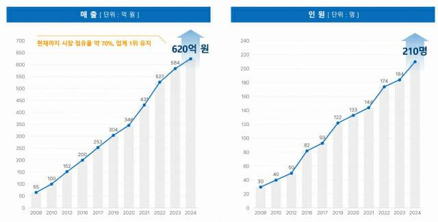 "회사 설립 4년후인 2007년에 매출 50억원을 넘었다. 100억을 돌파한 건 2010년이다. 이후 2019년 300억, 2022년 500억이 넘었다.작년(2024년)에는 600억을 돌파했다."