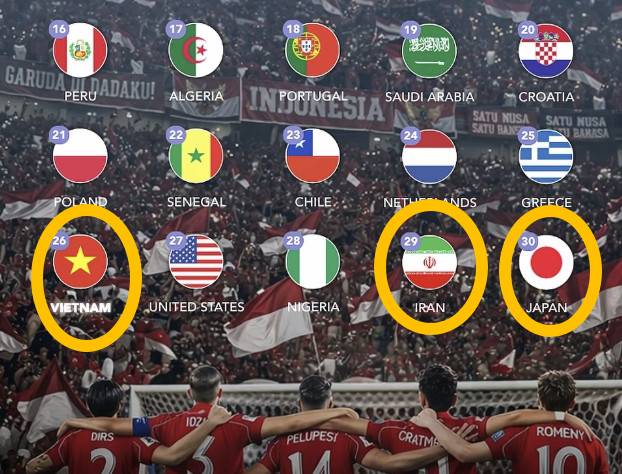 여기에 아시아 전체 1등은 인도네시아로 8위에 올랐다. 뒤이어 베트남이 26위, 이란이 29위, 일본이 30위에 올랐다.