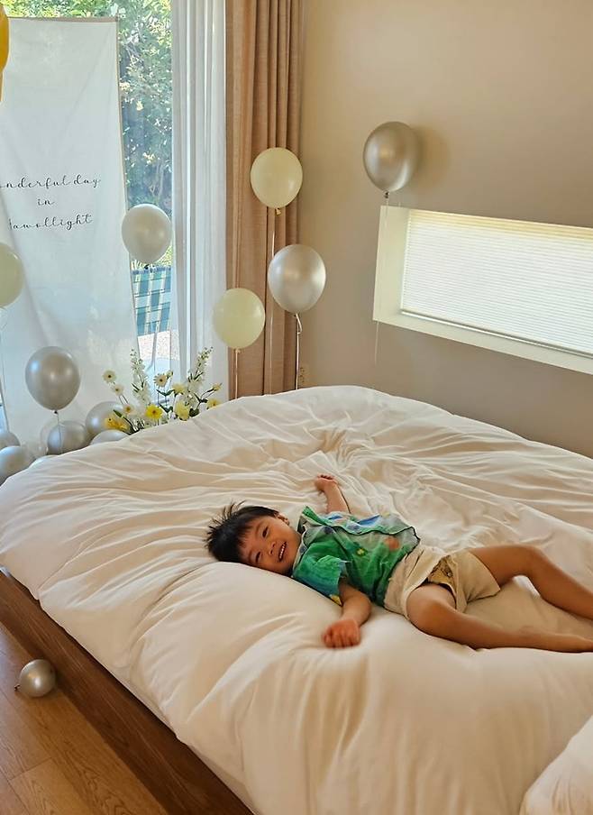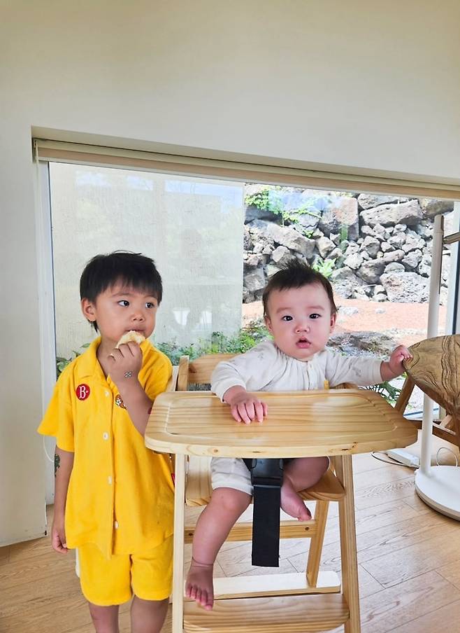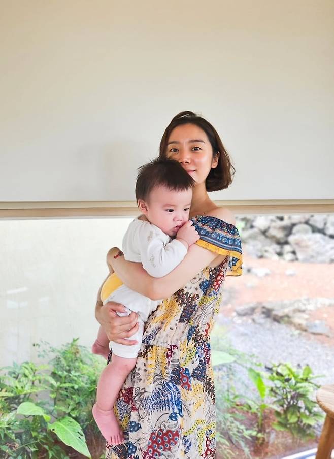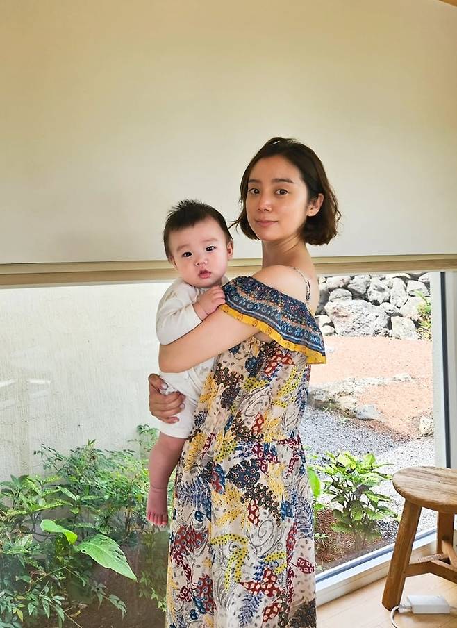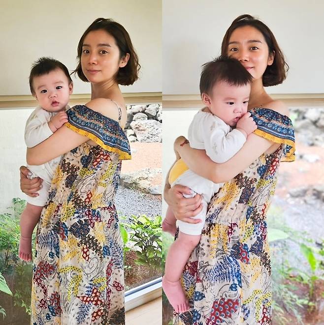 가수 겸 배우인 우혜림이 꼭 닮은 7개월 아들을 안고 에스닉 리조트룩으로 여유로운 분위기를 자아냈다.