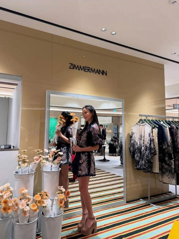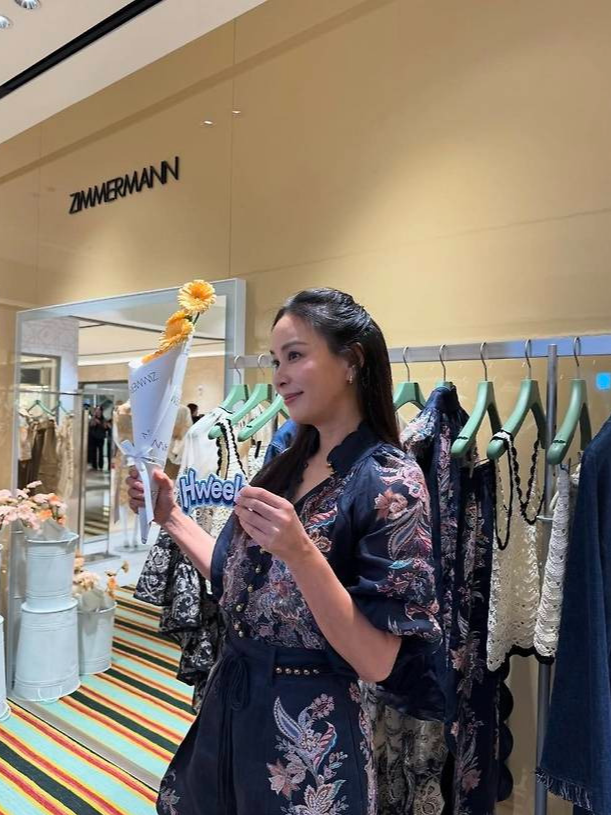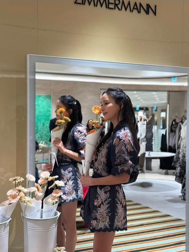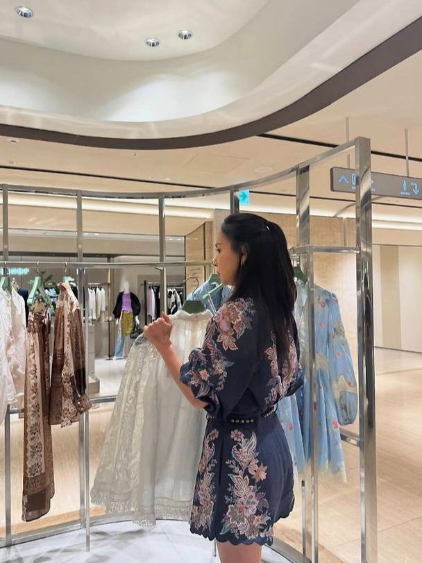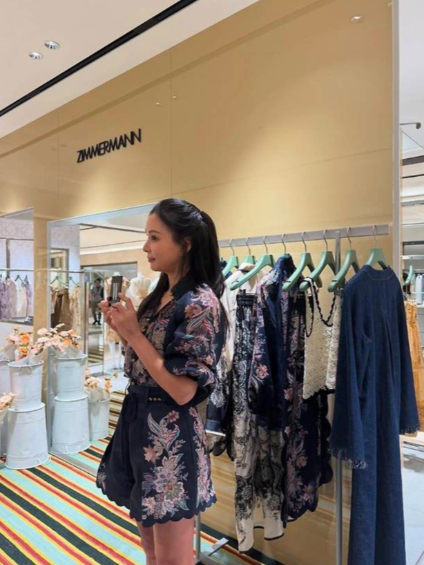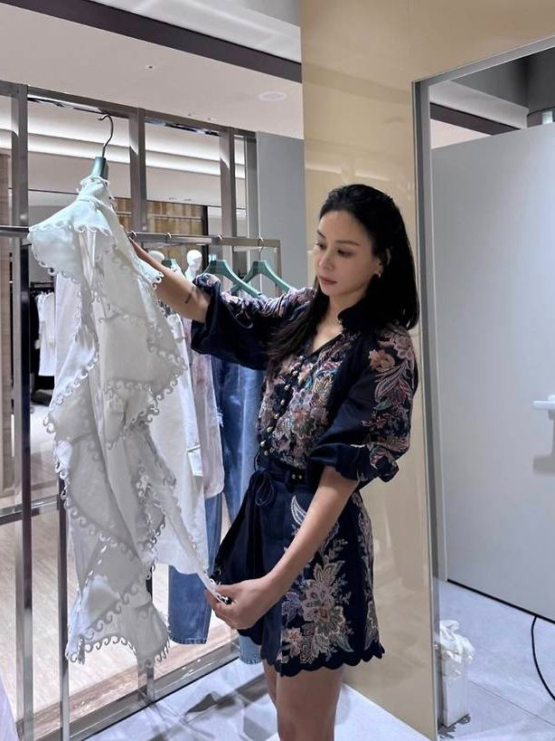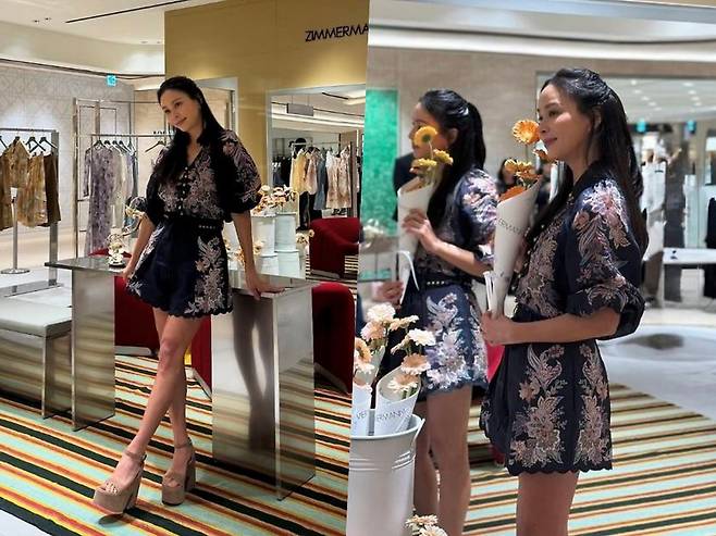 배우 고소영이 화려한 플라워 자수와 스캘럽 디테일이 돋보이는 네이비 룩으로 럭셔리 매장을 우아하게 물들였습니다.