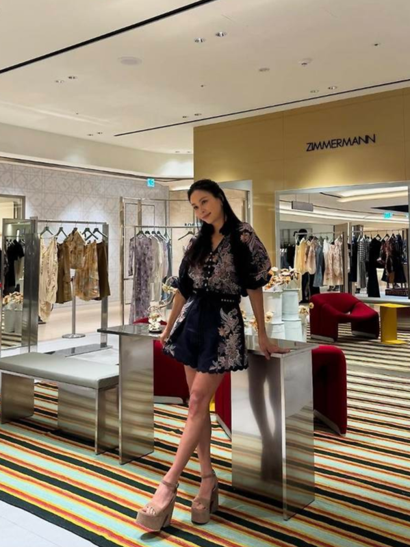 여기에 고소영은 베이지 톤의 플랫폼 힐로 전체적인 룩에 높이감과 스타일 포인트를 더하며, 도도하면서도 여유로운 럭셔리 백화점 나들이룩의 정수를 보여줬습니다.