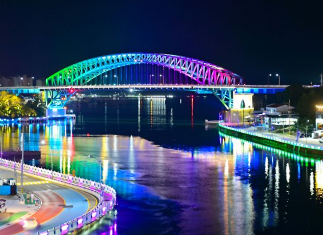 세종시 명소 금강보행교(이응다리)도 밤에 돋보입니다. 까만 하늘에 동그란 띠가 걸린 듯한 디자인이 독특합니다. 높이 34m의 금강보행교 전망대에서 화려한 다리와 빛나는 도시 경관이 금강에 비친 야경을 볼 수 있습니다. 운영 시간은 오전 6시~오후 11시(연중무휴), 이용료는 없습니다.