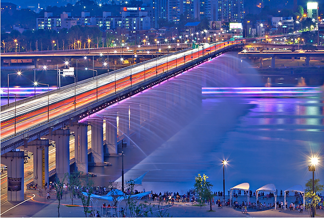반포대교에 있는 달빛무지개분수는 상류 쪽과 하류 쪽 길이가 총 1140m에 이르러, 2008년 ‘세계에서 가장 긴 교량 분수’로 기네스북에 등재됐습니다. 4월부터 10월까지 하루 5~6회 분수를 가동합니다. 음악에 맞춰 조명이 시시각각 변하고, 스윙 노즐에서 나오는 물줄기가 너울져 한강을 아름답게 물들입니다.