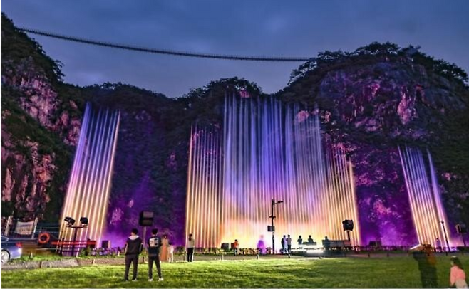 원주 대표 유원지 간현관광지가 최근 몇 년 새 크게 달라졌습니다. 2018년 높이 100m에 길이 200m 산악 보행교 소금산출렁다리가 개장했고, 고도 약 200m 절벽을 따라 소금잔도가 놓였으며, 주변 절경이 한눈에 담기는 스카이타워가 들어섰습니다. 여기에 소금산출렁다리보다 2배 긴 소금산울렁다리가 합세했습니다. 이 시설을 아울러 소금산그랜드밸리라 합니다. 야간에는 나오라쇼를 펼칩니다.