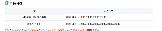 디피랑 운영 시간 : 오후 7시 30분부터 자정까지(9월 기준, 입장 마감 10시 30분), 매주 월요일과 1월 1일, 명절 당일 휴장합니다.