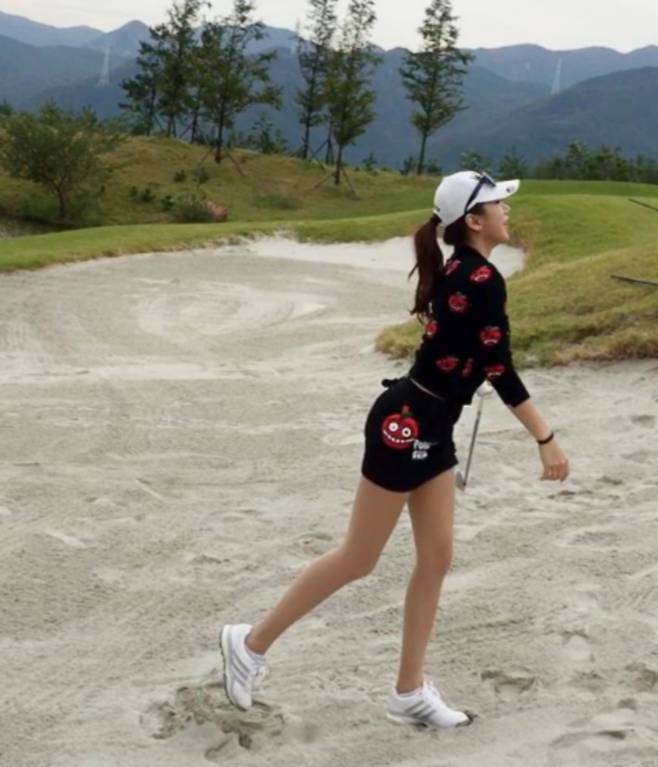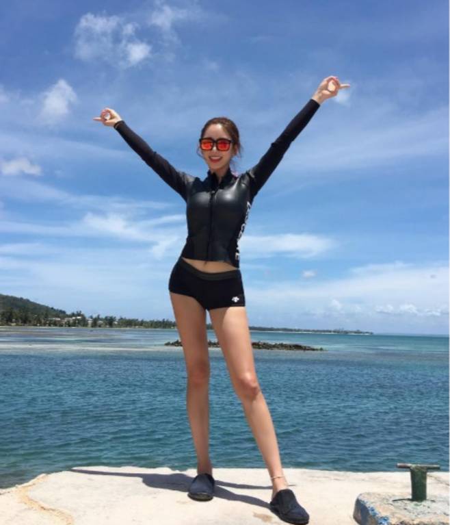 블랙 집업 래쉬가드와 숏팬츠로 액티브한 매력 완성시켰는데요.