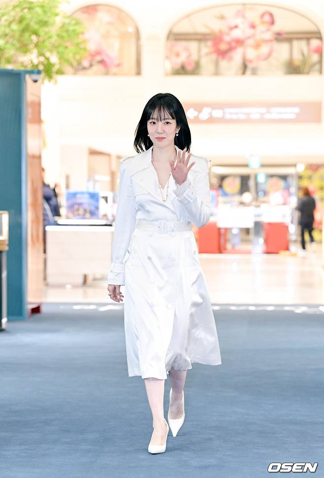 화이트 트렌치코트 + 화이트 힐 + 화이트 액세서리로 통일된 룩을 선보인 임수정은 전체적으로 깔끔하고 세련된 분위기를 연출했다.
