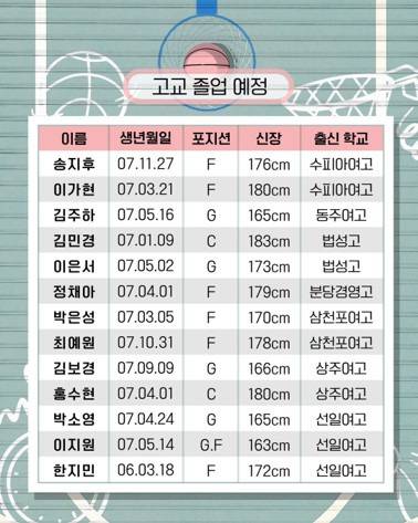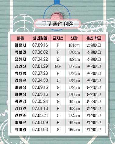 이번 드래프트에는 고등학교 졸업 예정자뿐 아니라 대학 졸업 예정자, 재일동포 및 외국 국적 동포 선수들까지 다양하게 참가했습니다. 이가현(수피아여고), 최예원(삼천포여고), 홍수현(상주여고), 황윤서(선일여고), 김연진(숙명여고), 이원정(온양여고) 등은 U-19 여자농구 월드컵에서 한국의 9위 성적을 이끈 국가대표로 주목받고 있습니다.