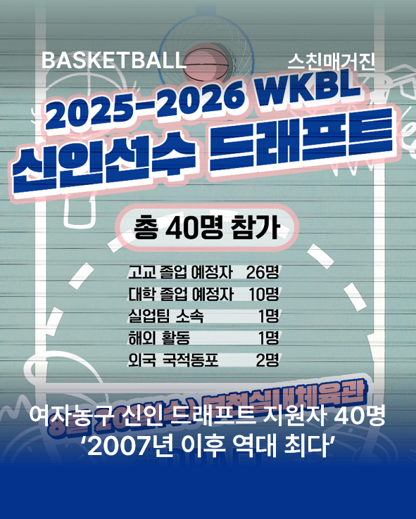 한국여자농구연맹(WKBL)은 2025-2026시즌 신인선수 드래프트에 2007년 단일리그 도입 이후 가장 많은 40명의 선수가 지원했다고 6일 밝혔습니다. 이는 2007년 개최된 2008년 드래프트 당시의 34명을 넘어선 역대 최다 기록입니다.