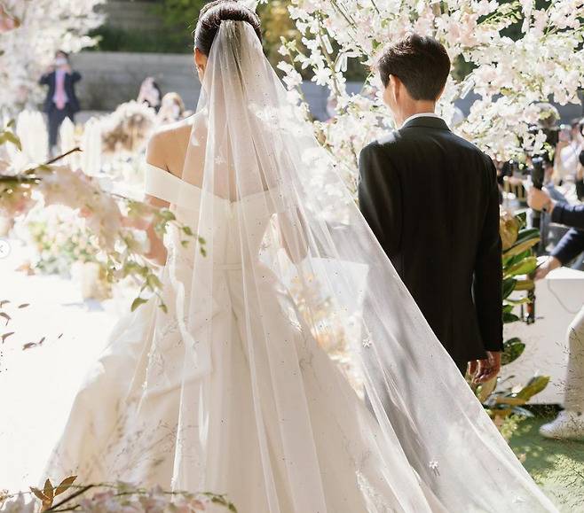 실크 자가드 드레스는 주로 미니멀하면서도 구조적인 실루엣을 가진 디자인에 사용되며, 패턴 자체가 돋보이기 때문에 장식이 과하지 않아도 충분히 화려한 느낌을 낼 수 있다. 플로럴, 다마스크, 기하학적 문양 등 다양한 패턴이 은은하게 표현되어 움직일 때마다 빛의 반사에 따라 드라마틱한 분위기를 자아낸다. 이러한 특징 덕분에 주얼리나 액세서리를 과하게 하지 않아도 단아하고 완성도 높은 웨딩룩이 완성된다.