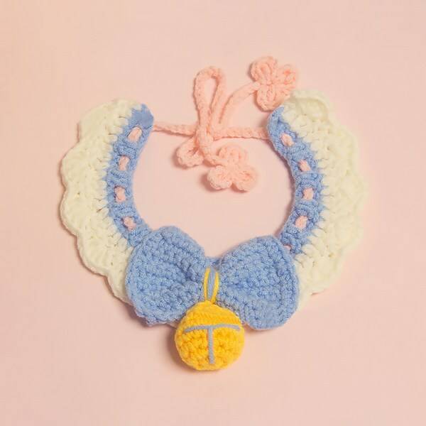 리본과 큰 방울이 귀여운 고양이 케이프예요. 파스텔톤의 파랑, 노랑, 아이보리, 분홍색 조합이라 고양이를 더 화사해 보이게 해준답니다.