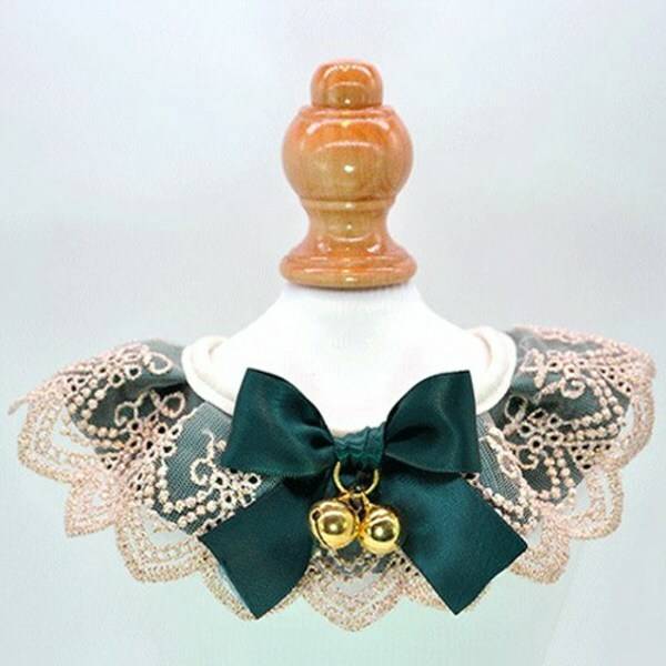 고급스러운 초록색과 레이스가 달린 고양이 케이프예요. 끈도 신축성이 있어서 길이 조절도 가능하답니다.