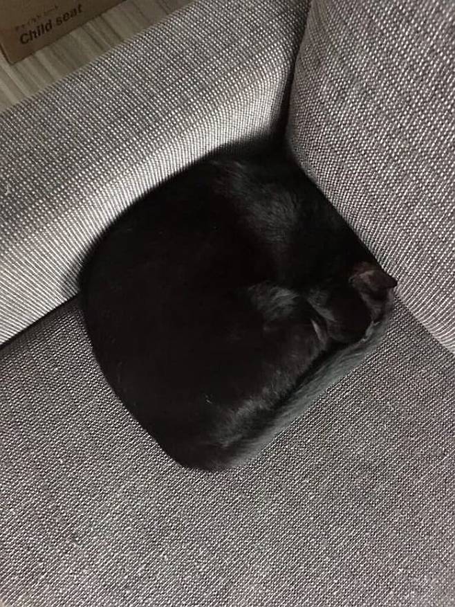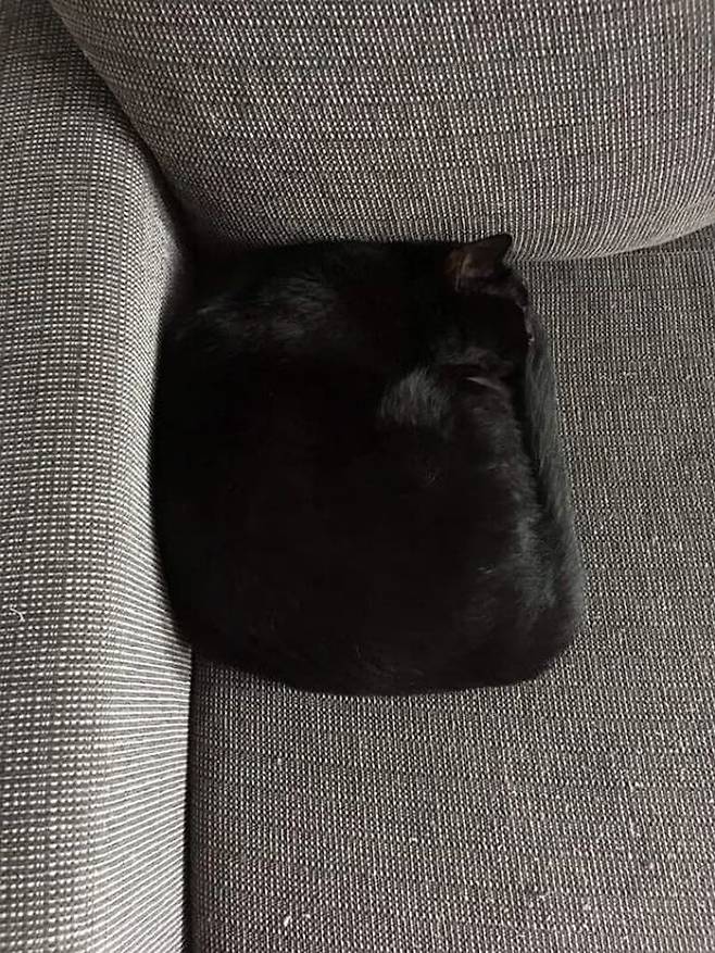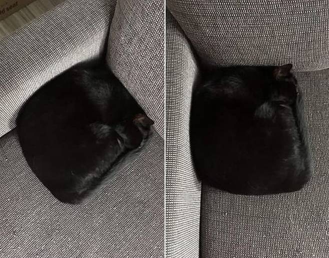네, 그렇습니다. 알고 봤더니 소파에 놓여져 있는 검은색 쿠션은 사실 진짜 쿠션이 아니라 고양이가 몸을 직각처럼 말아서 자고 있었던 것이었는데요.