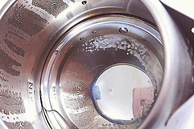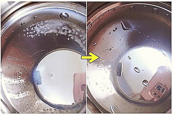 잠시 후 확인해 보시면 손으로 빡빡 닦지 않았는데도 석회가 말끔히 제거됐습니다. 식초로 끓여주시면 광도 나는 느낌이에요.