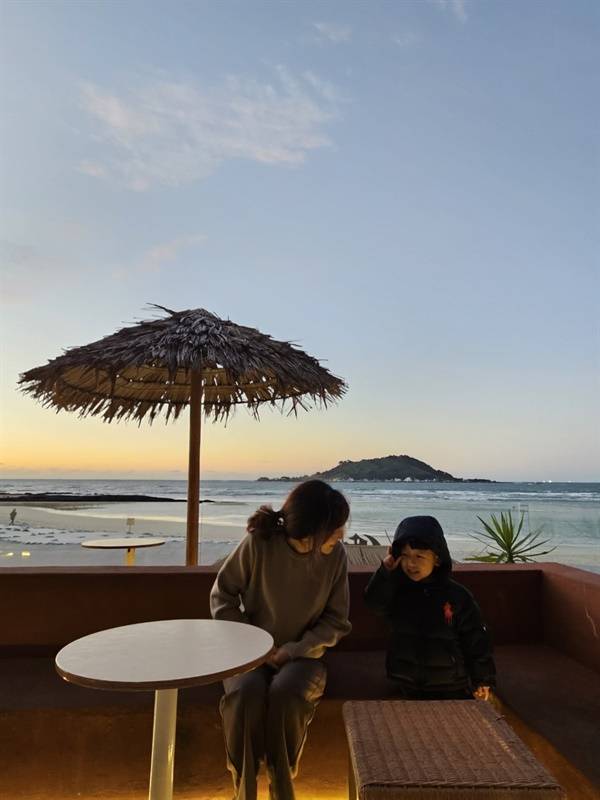 | ▲ 제주 핫플 까페에서 노을지는 제주 해변 까페에서 딸과 손자 |