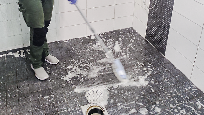 청소할 때는 고무장갑을 착용하고, 눈에 튀지 않도록 분사 방향에 주의해야 한다.