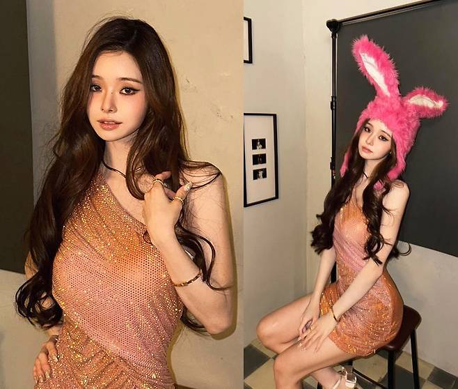 특히 눈길을 끄는 핑크 토끼 모자를 매치해 드레스의 섹시한 무드와 상반되는 귀여운 디테일로 개성을 한껏 드러내며 유니크한 매력을 돋보였습니다.