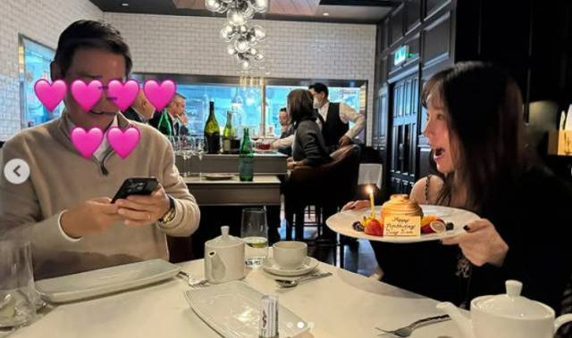사진 속 김정은은 고급 레스토랑에서 케이크를 들고 함박웃음을 지었다. 스티커로 가렸지만, 함께 웃고 있는 남편의 표정이 눈길을 끈다.