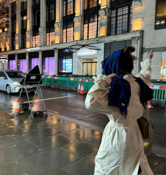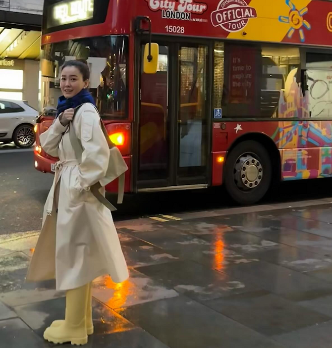 정유미는 영국에서 버버리 기장이 긴 롱트렌치 코트를 입고 여행룩을 선보여 눈길을 끌었다.